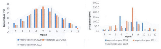 All the three growing seasons under analysis were similar in terms of average monthly air temperature. In terms of precipitation, the 2020 and 2021 growing seasons were similar, while the 2022 growing season was clearly drier.