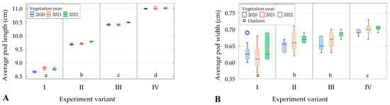 Boxplots for the size of bean pods in the trial with beans in Haplic LUVISOLS soil type, showing (A) length and (B) width. abcd—mean values in the groups not containing the same letter differ significantly at α = 0.05.