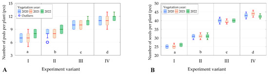 Similar trends to those observed for the average pod count per plant were obtained for the average seed count per plant (Figure 3B). The lowest average seed count per plant was recorded for experimental variant I (an average of 25.3 pods). There was an increase of 22.5% for experimental variant II (an average of 31 pods), 56.8% for variant III (an average of 39.7 pods), and 70.1% for variant IV (an average of 43.1 pods). The year of analysis had a significant impact on the seed count.