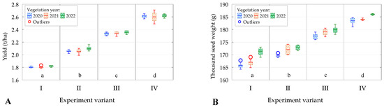 Boxplots for yield size indicators of the trial with beans in Haplic LUVISOLS soil type. (A) yield and (B) thousand-seed weight. abcd—mean in groups not containing the same letter differ significantly at α = 0.05.