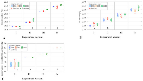 Boxplots for contents of (A) protein, (B) fat, and (C) carbohydrates in 100 g of beans grown on Haplic LUVISOLS soil type. abcd—mean in groups not containing the same letter differ significantly at α = 0.05.