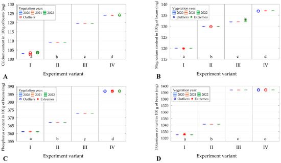 Boxplots for microelement contents of the trial with beans on Haplic LUVISOLS soil type: (A) calcium, (B) magnesium, (C) phosphorus, (D) potassium. abcd—mean values in the groups not containing the same letter differ significantly at α = 0.05.