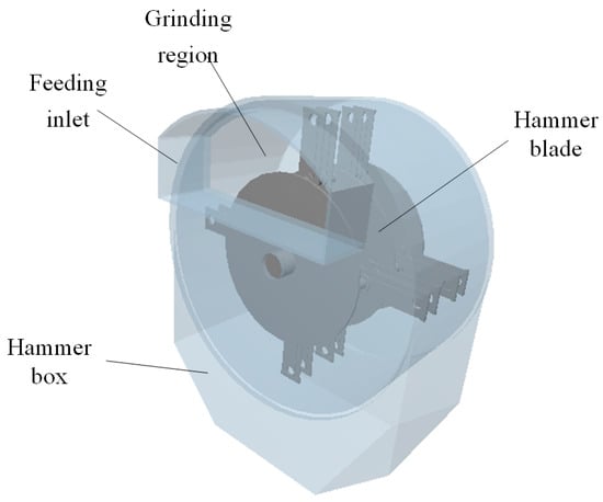 Now, as one of the most widely applied machines, the hammer mill has significantly affected the grinding of Jun-Cao in terms of the structure, quantity and motion state of hammer blades []. By comparing the laws affecting the working efficiency of mill and the specific energy consumption through the T-shaped hammer blade and the traditional hammer, Bochat et al. [] found that such a hammer blade could improve the screening efficiency after the grinding of materials by breaking the circulation layer formed during the rotation of materials after the comparison. With the development of computer field and various optimization algorithms, optimization algorithms are gradually being introduced into various fields, including structural design. Paraschiv et al. [] improved the hammer of hammer mill from several aspects and obtained the optimal blade structure. Tekgüler et al. [] studied the influence of slotted screen and round-hole screen on the working performance of mills. Evans et al. [] studied the influence of mesh diameter and blade velocity on the grinding effect, revealing that there was a slightly significant linear relationship between mesh diameter and blade velocity with the geometric mean particle size and geometric standard deviation. Djordjevic et al. [] suggested the use of DEM technology to analyze the grinding operation. Afterwards, Ghodki et al. [] simulated the state of seeds in a mill and analyzed the grinding effect based on the DEM. Chen et al. [] designed a straw fiber crusher, and explored crusher parameters and working effect with central composite experiments by DEM simulation. Egorov et al. [] revealed that a rotary stirring machine could improve particle distribution uniformity in their research. Cotabarren et al. [] proposed a developed model to predict the dynamic behavior of a hammer mill, which provides research based on milling performance and could predict confidence operating point. Vanarase et al. [] compared the conical grinder with hammer mill regarding the grinding effect, revealing that the conical grinder could achieve a better grinding effect while a hammer mill would discharge the materials that were not completely ground. Similarly, Vukmirovic et al. [] compared the effects through two different grinding methods, and their result showed that materials were more uniform in size after grinding by roller mill but generally had a larger diameter; this was quite contrary for the hammer mill. Wang et al. [] designed a pointed hammer and a bevel-faced hammer. The DEM analysis revealed that using the pointed hammerhead would improve the productivity of hammerhead mill. However, the adoption of beveled hammerhead would reduce the power consumption per ton and the temperature rise of feeding materials. At present, the research on biomass crushing is related to the fact that the research object is quite different from Jun-Cao. On the other hand, the research is focused on the hammer structure [,,,,], model prediction [], flow field analysis [] and properties analysis [,,], and the analysis of the force model in the crushing process is relatively vague.