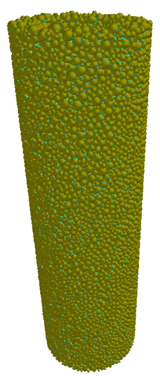Figure 4 shows the process of acquiring the particle model. Firstly, a cylindrical particle factory with a length of 180 mm and a diameter of 40 mm were built with the model set to be Physical. Then, a Jun-Cao stalk model with a length of 60 mm, an outer diameter of 20 mm and an inner diameter of 13 mm was inserted into the cylinder, and this model was set to be Virtual. The Whole and Fraction particles were generated in this particle factory without the introduction of bonds temporarily. After the whole cylinder was filled with particles, we returned to the setting interface to revise the external cylindrical model to be Virtual and set the Jun-Cao stalk model to be Physical. Meanwhile, by replacing the Whole particles with Fraction particles through particle replacement, redundant particles would fall down due to the gravity. Finally, with the introduction of bonds into the remaining particles in the Jun-Cao stalk model and the saving of Material block, the Jun-Cao stalk model was then constructed, where there were a total of 20,858 particles and 113,088 bonds in a single Jun-Cao stalk.
