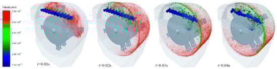 Figure 6 shows the material velocity distribution in 0.01 s–0.04 s after the mill began to work. At 0.01 s, the forepart of the Jun-Cao stalk was smashed and ground by the hammer after it entered the operating region. After the grinding, Jun-Cao particles moved rapidly and dispersed but the rear part of Jun-Cao remained unchanged. At 0.02 s, particles of the ground Jun-Cao scattered on the inner wall and at the same time, some material blocks that failed to be smashed completely slowly separated from the Jun-Cao stalk. At 0.03 s, more material blocks that failed to be ground completely arose on the Jun-Cao stalk and some Jun-Cao particles gradually began to move slower. At 0.04 s, when the whole Jun-Cao stalk entered the grinding region, more and more material blocks that failed to be smashed completely arose and the Jun-Cao particles moved even more slowly as a whole.