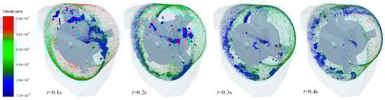 Figure 7 shows the velocity distribution of Jun-Cao particles within the mill in the period of 0.1 s–0.4 s. At 0.1 s, the velocity of Jun-Cao particles became relatively stable. But in the grinding region, there were still lots of material blocks in large size failing to be crushed completely. At 0.2 s, the velocity of the whole material was further reduced and some material blocks that failed to be ground completely became smaller in size due to the impact of the hammer. At 0.3 s, the velocity of material gradually tended to be stable and the material blocks became even smaller in size due to the smashing. At 0.4 s, the grinding operation was basically completed, but some material blocks still failed to be ground. The reason might lie in the wide gap between the hammer and the inner wall caused by the insufficient length of the hammer.
