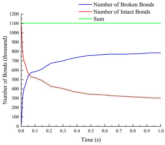 Figure 8 shows the bond breakages in Jun-Cao stalk. There were totally 1,103,422 bonds after the formation of Jun-Cao stalk. Then, the number of unbroken bonds dwindled down while the number of broken bonds increased gradually. In the period of 0 s–0.1 s, numerous bonds in Jun-Cao stalks were damaged with the number of broken bonds rising from 0 to 600 thousand. In fact, more than half of the bonds were broken in this period. In the period of 0.1–0.6 s, bonds in the Jun-Cao stalks continued to be damaged at a certain rate with the number of broken bonds rising from 600 thousand to 750 thousand. After 0.6 s, the grinding efficiency became rather poor with a very small number of bonds having been broken. At this moment, the mill was in a stable state.