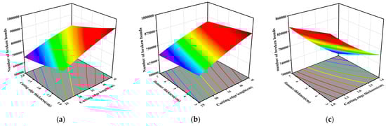 As indicated in Figure 9, the response surface between A (the cutting edge length), B (the cutting edge thickness) and C (the hammer thickness) with Y (the number of broken bonds) was plotted according to the quadratic regression equation for the number of broken bonds. Figure 9a shows the interaction between A and B with the number of broken bonds when the hammer thickness C was 5 mm. As shown in the figure, when B remained unchanged, the number of broken bonds would rise linearly with the increase in A from 25 mm to 45 mm. However, when A remained unchanged, the number of broken bonds would drop linearly with the increase in B from 1 mm to 3 mm. At least 650,000 bonds were damaged when A was 25 mm and B was 3 mm. But when A was 45 mm and B was 1 mm, the number of broken bonds was around 920,000 to the maximum. Figure 9b shows the interaction between A and C with the number of broken bonds when B was 2 mm. As indicated in the figure, when C remained unchanged, the number of broken bonds went up linearly with the increase in A from 25 mm to 45 mm. However, when A remained unchanged, with the increase in C from 3 mm to 7 mm, there was a slightly linear decline in the number of broken bonds. When A was 25 mm and C was 7 mm, the number of broken bonds was roughly 680,000 to the minimum. But when A was 45 mm and C was 3 mm, the number of broken bonds was up to be around 880,000 maximally. Figure 9c shows the interaction between B and C with the number of broken bonds when A was always 35 mm. As shown in the figure, when C remained unchanged, the number of broken bonds reduced linearly with the increase in B from 1 mm to 3 mm. When B remained unchanged, with the increase in C from 3 mm to 5 mm, there was a slightly linear decline in the number of broken bonds. When B was 3 mm and C was 7 mm, the number of broken bonds was 700,000 to the minimum. When B was 1 mm and C was 3 mm, the number of broken bonds was up to around 850,000 maximally.
