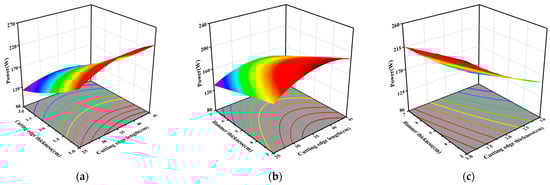 As shown in Figure 10, the response surface between A (the cutting edge length), B (the cutting edge thickness) and C (the hammer thickness) with P (the mean power) is plotted according to the quadratic regression equation for mean power. Figure 10a shows the interaction between A and B with the mean power P when C was 5 mm. As indicated in the figure, when B remained unchanged, the mean power increased and then declined with the increase in A from 25 mm to 45 mm. When A remained unchanged, the mean power P showed a downward trend with the increase in B from 1 mm to 3 mm. When A was 25 mm and B was 3 mm, P (the mean power) reached the minimum value of about 110 W. However, it reached its maximum of around 240 W when A was about 38 mm and B was 1 mm. Figure 10b shows the interaction between A and C with the mean power P when B was 2 mm. As shown in the figure, when C remained unchanged, P first showed an upward trend and then declined with the increase in A from 25 mm to 45 mm. When A was kept unchanged, P showed a slightly downward trend with the increase in C from 3 mm to 7 mm. When A was 25 mm and C was 7 mm, P reached the minimum value of about 120 W. However, it reached its maximum of around 200 W when A was 37 mm and C was 3 mm. Figure 10c shows the interaction between B and C when A was 35 mm. As shown in the figure, when C was fixed, P showed a downward trend with the increase in B from 1 mm to 3 mm. In the case of B unchanged, P showed a small declining trend when C was increased from 3 mm to 7 mm. When B was 3 mm and C was 7 mm, P reached the minimum value of about 100 W; however, it reached a maximum of about 250 W when B was 1 mm and C was 3 mm.