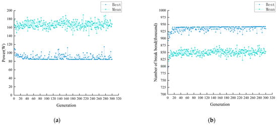Figure 11 shows the optimization iteration process with good iteration convergence, and a total of 300 iterations were performed. Most of the optimum power was above 84 W with the number of broken bonds being less than 950,000. Table 7 shows the optimal solution set obtained after the iterations.