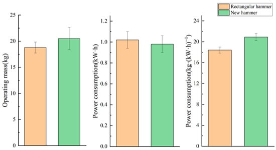 Figure 12 shows the result of the contrast test. The five tests revealed that through the traditional rectangular hammer mill, the mean operating mass was 18.78 kg in 10 min with a standard deviation of 1.05, the average power consumption was 1.02 kW·h with a standard deviation of 0.08 and the average output per kilowatt-hour was 18.41 kg/(kW·h) with a standard deviation of 0.58. However, with our brand-new hammer, the mean operating mass was 20.49 kg with a standard deviation of 2.14, the average power consumption was 0.98 kW·h with a standard deviation of 0.08 and the average output per kilowatt-hour was 20.90 kg/(kW·h) with a standard deviation of 0.68. The results show that compared with the traditional hammer, the new hammer increases the power generation per kilowatt-hour by 13.55% on average, the average operating capacity by 8.34% and the average power consumption by 3.92%.
