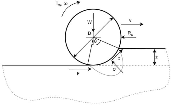 Based on the simplified model of the wheel–soil interaction shown in Figure 2, the equilibrium of the horizontal and vertical forces is written as follows: