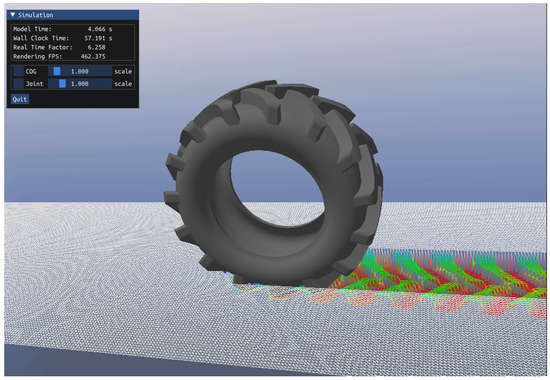 Project Chrono supports multi-ore, distributed computing modes and can harness GPU power for particle motion modeling. It can be faster than real time when using rigid surfaces, although its performance significantly degrades with increasing deformable terrain size. The environment created in Project Chrono is presented in Figure 3. It consisted of flat terrain created using the Soil Contact Model (SCM) deformable terrain class [38], built upon the Bekker–Wong theory, but also taking into account contact kinematics and the pressure distribution in the footprint. The terrain was modeled using a mesh, which could be deformed only in the vertical direction.