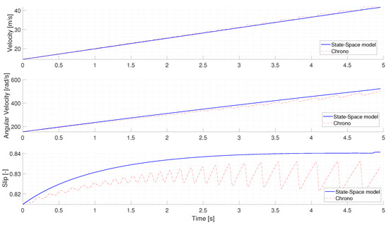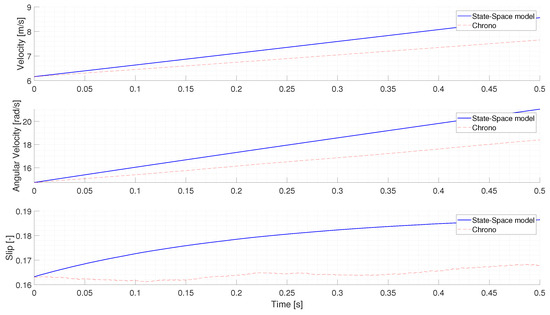 The tests were carried out using different wheel torques. Another example is presented in Figure 5, where the input torque is ca. 1570 Nm. As can be seen, the difference between the two models increases in the case of lower slip values. The LPV model overestimates the angular and longitudinal velocities compared to the Chrono simulation. While there is a difference between the exact values, the main characteristics of the two models are similar. Furthermore, overestimating the values errs on the side of caution.