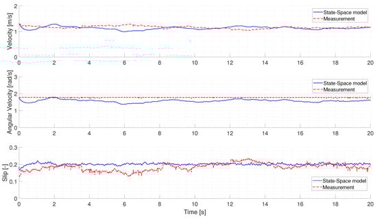 The absolute differences between the simulated and measured velocities are small. The maximum absolute error of the longitudinal velocity is below 0.3 m/s and 0.5 rad/s in the case of the angular velocity. On the other hand, the relative errors are significant due to the low reference values, which is also reflected in the slip, where the absolute error of the model reaches 0.06. While the difference could be caused by both parameter uncertainty and simplifications of the model, it is interesting to note that the errors significantly decrease after 8 seconds.