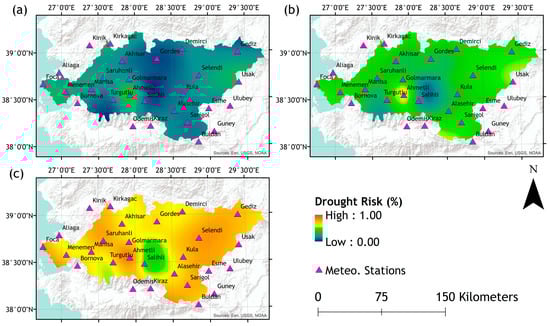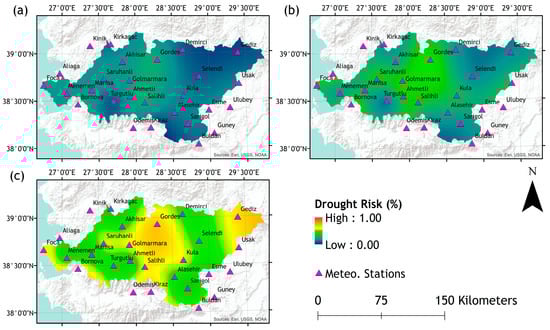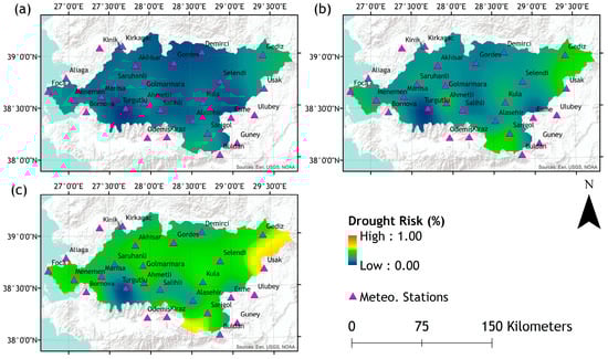 Drought risk maps of (a) 3-month, (b) 6-month, and (c) 12-month periods according to SPEI-3.