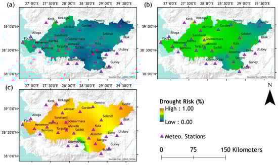 Drought risk maps of (a) 3-month, (b) 6-month, and (c) 12-month periods according to SPI-3.