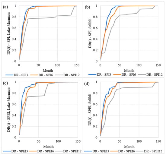 Drought risk curves of Lake Marmara (Golmarmara) and Salihli station according to (a,b) SPI and (c,d) SPEI.