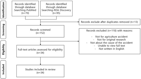 The literature search yielded a total of 165 papers: 70 from PubMed and 95 from RDA Discovery. After removing 13 duplicates, 152 papers remained. Applying the exclusion criteria led to the removal of 118 papers. The criteria for exclusion pertained to papers not related to agricultural accidents, not being original research, lacking specificity in accident causes, full-text unavailability, and non-English language publications. Consequently, the final selection for review was narrowed down to 34 papers (Table 2). Figure 1 presents a flowchart of the literature search and screening.