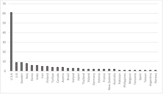An analysis was conducted on the country of origin of the 152 papers retrieved initially (after removing 13 duplicates), to identify the geographical distribution of research on agricultural accidents. This analysis, conducted before applying the exclusion criteria, revealed that the United States produced the highest number of papers (n = 61, accounting for 40.1% of the total), followed by United Kingdom and Sweden (each with n = 9, 5.9%), Italy (n = 8, 5.3%), South Korea and India (each with n = 6, 3.9%), and Iran and Finland (each with n = 5, 3.3%) (Figure 2).