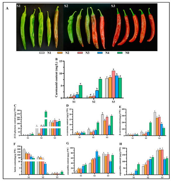 Phenotypes and pigment content of pepper fruits at different stages with nitrogen reduction. (A) Phenotypes of pigment pepper fruits. (B) Total carotenoids of pigment pepper fruits. (C–H) Contents of six carotenoids fractions of pigment pepper fruits. Data are presented as mean ± SD. Different letters (a, b, c, d, and e) indicate the significance of differences between nitrogen treatments (p ≤ 0.05).
