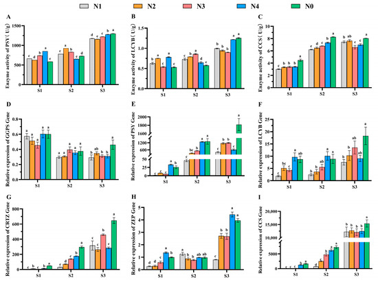 Enzyme activities of PSY (A), LCYB (B), CCS (C), and carotenoid gene expression (D–I) of pigment pepper fruits at different developmental stages under varied urea dosage. Different letters (a, b, c, d, and e) indicate the significance of differences between nitrogen treatments (p ≤ 0.05).