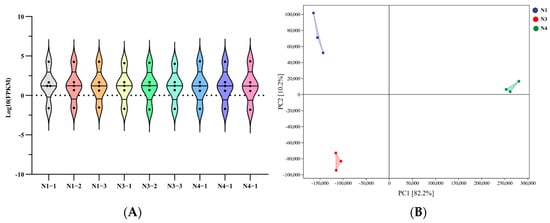 Distribution of kilobase per million exon kilobase fragment mapping (FPKM) in rNA-seq of pigment pepper fruits under urea reduction. (A) Violin plot; (B) FPKM-based principal component analysis.