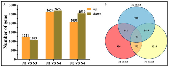 Differential genes of transcription metabolism (DEGs) were calculated based on log2 fold change (FC) ≥ 1 and false discovery rate (FDR)-corrected p-value ≤ 0.05. In the comparison of N1 vs. N4 and N3 vs. N4, there were 5321 and 4590 differentially expressed genes, respectively, which were significantly higher than that of N1 vs. N3 (Figure 4A). The Venn plot (Figure 4B) showed that there were 1522 co-expressed genes, while 778 and 3799 genes were specifically expressed in the comparison of N1 vs. N3 and N1 vs. N4. Among DEGs in the two pairwise groups, 8134–17,192 genes were successfully annotated to one of the five public databases (Figure S1).