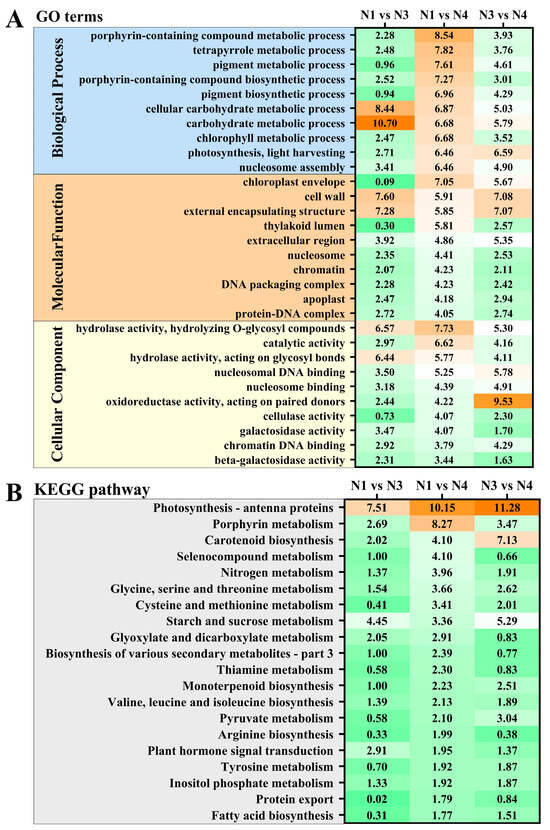Differentially expressed genes (DEGs) can be categorized into various metabolic pathways based on biological processes, molecular functions, and cellular components. Figure 5A presents the top 10 enriched metabolic pathways of DEGs, including porphyrin-containing compound metabolic processes, tetrapyrrole metabolic processes, pigment metabolic processes, chloroplast envelope, cell wall, external encapsulating structure, hydrolyzing O-glycosyl compounds, catalytic activity, and acting on glycosyl bonds. Notably, the most differently expressed genes were enriched in the N1 vs. N4 comparison (Table S1; Figure 5A, right column). In the pigment metabolic processes and pigment biosynthesis processes, −log10 (p-value) of DEGs were 7.61 and 6.96 in N1 vs. N4, which were much higher than those of N1 vs. N3 (0.96, 0.94) and N3 vs. N4 (4.61, 4.29). There was a similar trend in the chloroplast envelope, where carotenoid was produced (Figure 5A, right column).