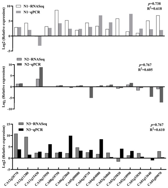 RNA was examined by Nanodrop spectrophotometry (Nanodrop Technologies, Wilmington, DE, USA) and a Nano 6000 Assay Kit from the Agilent Bioanalyzer 2100 system (Agilent Technologies, Santa Clara, CA, USA). A total of 1 μg RNA per sample was used to generate a cDNA library by NEBNext Ultra II RNA Library Prep Kit for Illumina (New England Biolabs Inc.; Ipswich, MA, USA). Messenger RNA (mRNA) was enriched by oligo beads, and synthesized cDNA. Used AMPure XP (Beckman Coulter, Brea, CA, USA) beads to select cDNA of approximately 400–500 bp in size, followed by PCR amplification, The PCR products were then purified again using AMPure XP beads to obtain 9 libraries, and the Sequel™ Sequencing Kit 2.0 was used to sequence 9 cDNA libraries. Then, 9 RNA-seq libraries were sequenced by the Illumina HiSeq 6000 (San Diego, CA, USA). cDNA library construction and RNA-seq were performed by Personal Bioinformatics Technology Co. (Shanghai, China). Low-quality reads were removed using Cutadapt 1.9.1 software, and the clean reads were mapped to the Pepper_1.55 reference genome (from the Sol Genomics Network) with the help of HISAT2 [34]. Based on the established reference genome, a mapping-based assembly approach was employed using the software StringTie 2.1.4 for assembling and splicing the mapped reads. The fragments per kilobase of transcript per million mapped reads (FPKM) for each gene was computed by considering the gene length and the count of reads mapped to it [35]. The raw transcriptome data underwent principal components analysis (PCA) and Pearson correlation based on gene expression profiles obtained from fragments per kilobase of exon per million fragments mapped (FPKM) among the nine samples using the package R 4.1.1. The identified transcripts underwent functional annotation against seven public databases, namely NR [36], KEGG [37], Swissprot [38], GO [39], and eggNOG [40], utilizing predefined parameters. GO enrichment analysis was carried out using GO-seq, and KEGG enrichment was performed with the hypergeometric test [41,42]. Differential expression analysis was performed using the DESeq R package [43]. Differentially expressed genes were identified with |log2FoldChange| > 1 and a significance p-value < 0.05. Transcription factor families were analyzed using the PlanTFDB database. The raw transcriptome data were deposited into the NCBI SRA (BioProject ID: PRJNA1087067).