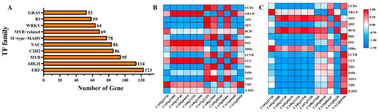 Analysis of differential transcription factors in pigment pepper fruits under urea reduction. (A) Top 10 transcription factor families; (B,C) heatmap of Pearson correlation analysis between NAC family and carotenoid genes of N1 (B) and N4 (C).