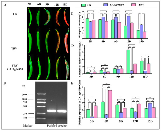 Silencing of the CA12g04950 gene in pigment pepper fruits using VIGS. (A) Fruits’ colors after silencing; (B) electropherogram of silenced CA12g04950 gene (left: DL2000 marker; middle and right: purified product); (C) total chlorophyll content of silenced fruits; (D) total carotenoid content of silenced fruits; (E) expression level of CA12g04950 in silenced fruits; * indicates significant differences between different treatments (* p ≤ 0.05, ** p ≤ 0.01, *** p ≤ 0.001, **** p ≤ 0.0001), ns indicates no significant differences between different treatments.