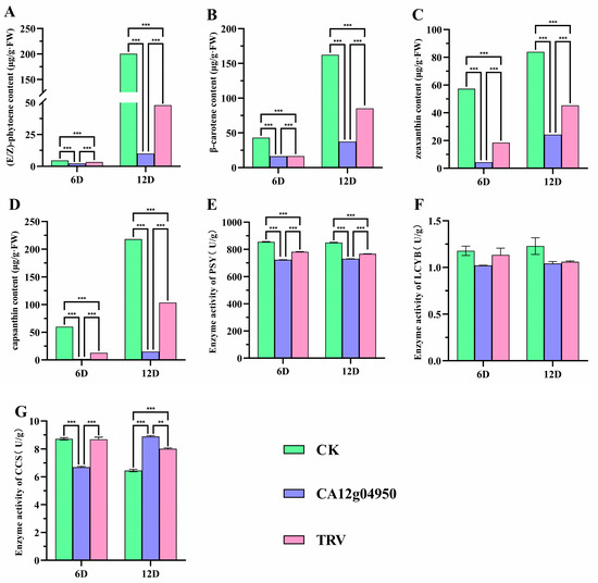 (A–D) Carotenoid Component Contents and (E–G) Metabolic Enzyme Activities of Pigment Pepper Fruits after Silencing the CA12g04950 Gene. (** p ≤ 0.01, *** p ≤ 0.001).