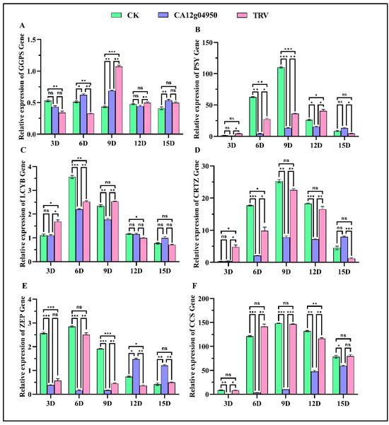 (A–F) Expression level of carotenoids’ genes of pigment pepper fruits after silencing the CA12g0495 (* p ≤ 0.05, ** p ≤ 0.01, *** p ≤ 0.001), ns indicates no significant differences between different treatments.