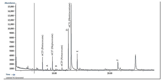 The different components of the cuticle hydrocarbon profile of the adult stage of D. devecta (non-winged form). The different capital letters above peaks indicate to different compounds.