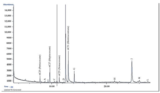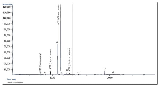 The different components of the cuticle hydrocarbon profile of the adult stage of D. plantaginea (non-winged form). The different capital letters above peaks indicate to different compounds.