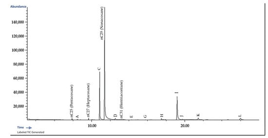 As the next step, we started an optimization process for the CHC extraction and detection methods, trialing different extraction periods to determine the optimal extraction period, in order to obtain the highest possible concentration of the CHC components from the aphids. The optimal duration of the CHC extraction from aphids is 30 min, and the optimal temperature is 70 °C (under elevated pressure). The optimal solvent/aphid individual ratio is 200 µL hexane to 25 aphid individuals. 25 aphid individuals (different species and developmental stages) were collected in clean GC-MS vials with a fine and clean paintbrush, then killed and kept in a freezer at −20 °C for five minutes. We added markings to the vials to identify the samples after the extraction. For the total CHC extraction we added 200 µL n-hexane (analytically pure) to the samples by micropipette. The micropipette tips were changed after every sample to prevent contamination from each other. We shook the vials for 1 min with a high-frequency mini shaker (IKA vortex). The extract (200 µL) was transferred by micropipette with clean micropipette tips to a GC vial equipped with a micro vial insert. The chemical analysis of the samples was conducted by GC-MS using an Agilent 6890N GC (Agilent Technologies, Santa Clara, CA, USA) with the 5973i MSD device. The GC-MS process had the following parameters: Oven temperature, 190 °C for 0.75 min (start temperature), then heating up with 8 °C/min to 320 °C and kept on the final temperature for 8 min. The GC device was equipped with an HP-1MS capillary column (DB-5ms 30 m × 250 µm × 0.25 µm: Cat. No.: J&W 122-5532). The volume of injection was 1 µL. The carrier gas was H2 at a constant flow of 2 mL/min. A split/splitless injector was set to splitless mode on 300 °C, with 10:1 split ratio. The solvent delay was three minutes. In the selected ion monitoring (SIM) acquisition mode, the selected ions were 55; 57; 71; 85. For data acquisition, analysis, and evaluation we used Agilent MSD ChemStation E.02 software. The molecular formula for the four standards of cuticle hydrocarbon components: pentacosane C25H52 (n-C25); heptacosane C27H56 (n-C27); nonacosane C29H60 (n-C29); hentriacontane C31H64 (n-C31). The GC-MS was calibrated based on the different concentration standard mixture solutions, and the retention times of the four standards (nC25 (pentacosane); nC27 (heptacosane); nC29 (nonacosane); nC31 (hentriacontane) [Figure S1 in Supplementary Materials (SM)]. The GC-MS detectable hydrocarbon components (comprising 16 peaks) of the cuticle extract of the four aphid species, were initially distinguished based on their mass spectra and retention index values [Figure 1, Figure 2, Figure 3 and Figure 4; Table 1 and Table 2]. The splitless injection method of GC showed significantly greater peak areas and lower background noise level, than the split method. The detecting method FID (flame ionization detector) showed more separated peaks and lower background noise compared to MS (mass spectroscopy).