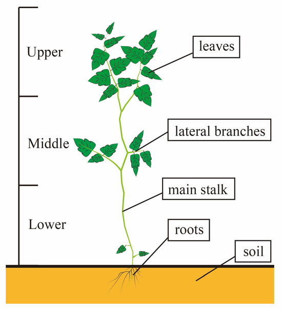 On 12 April 2023, a random sample of greenhouse cherry tomato vines was collected from a vegetable production base on Guli Street, Jiangning District, Nanjing City, Jiangsu Province, China. Healthy, fresh plants without pests or diseases were carefully selected, and efforts were made to minimize stalk damage. The morphological structure of a single tomato vine plant is depicted in Figure 1, comprising leaves, lateral branches, the main stalk, and roots. The main stalk was subcircular in the cross-section. Subsequently, the samples were harvested, with the leaves and lateral branches removed, leaving the middle stalk as the primary focus for testing.