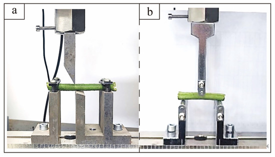 The tests used a WDW-20-type microcomputer-controlled electronic universal testing machine from Jinan Chuan Bai Instrument Co., Ltd, Jinan, China. Tomato stalks underwent shear and bending tests. The specimens were 80 mm long and obtained from the middle section of the stalks to ensure uniformity and integrity. Over 20 sets of stalks were prepared for the shear and bending tests. In the shear tests, ten 80 mm tomato stalks were selected and numbered. The test points were located at the midpoints. A uniform downward load was applied at a rate of 25 mm min−1. Carbon steel inserts with a thickness of 15 mm and an edge angle of 30°, as shown in Figure 2a, were used. A three-point bending method was applied to measure the elastic and shear moduli of the stalks in the bending tests. The outer diameter and bast thickness were measured at the center of each stalk. A continuous vertical load of 1 mm min−1 was applied during the bending tests, as illustrated in Figure 2b.