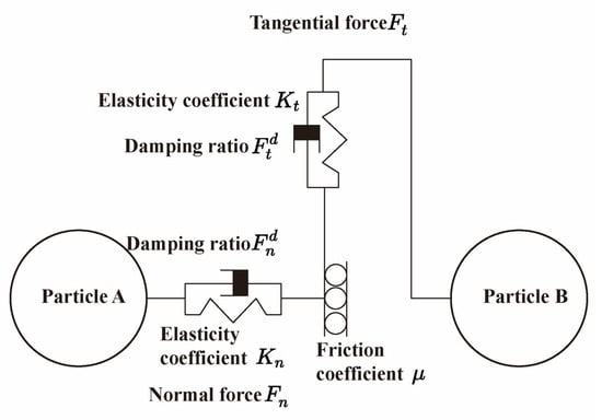 where Fn is the normal force; is the normal damping force; Ft is the tangential force; is the tangential damping force; E* is the equivalent Young’s modulus; R* is the equivalent radius; δn is the normal overlap; δt is the tangential overlap; m* is the equivalent mass; is the normal component of the relative velocity; Sn is the normal stiffness; G* is the equivalent shear modulus; and is the relative tangential velocity.