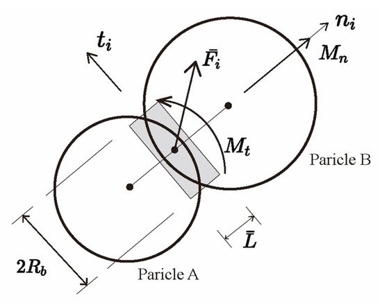 In the Bonding V2 model, a virtual beam cell is formed between two spherical particles (Figure 4), denoted as the bond. The bond transfers the forces and moments between the particles. When the stress exceeds a predetermined strength, the bond fails and cannot be reintroduced [11]. The contact radius should be set to 20–30% above the actual physical radius of the particles [13]. The bond breaks when the stress exceeds the maximum value.