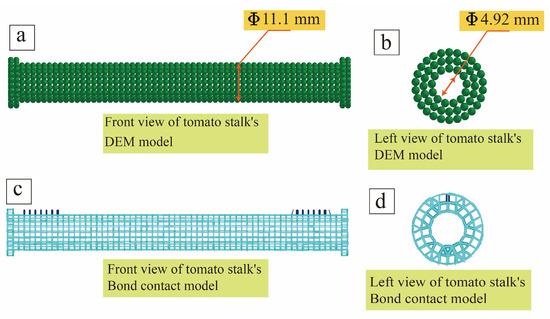 Schematic of the DEM and bond contact models of the tomato stalk: (a) Front view of tomato stalk’s DEM model; (b) Left view of tomato stalk’s DEM model; (c) Front view of tomato stalk’s bond contact model; (d) Left view of tomato stalk’s bond contact model.