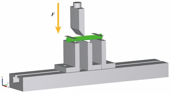 In the stem mechanics simulation, the corresponding stem model had the same length as the actual specimen. In the simulation calculations, the auxiliary fixed components, which were irrelevant to the stem mechanics tests, were removed. The three-dimensional software SolidWorks 2022 was used to establish the corresponding test fixture and shear tool model, which were then imported into the EDEM software. Simulation accuracy and efficiency were carefully balanced to ensure the continuity of the simulation. A fixed time step of 1.57 × 10−6 s was set for the simulation calculations. Based on the measured test method, the tool was loaded onto the stem simulation model at a loading rate of 25 mm min−1 with a preload force of 0.2 N. The discrete element geometry used for the stem mechanics simulations is shown in Figure 6.
