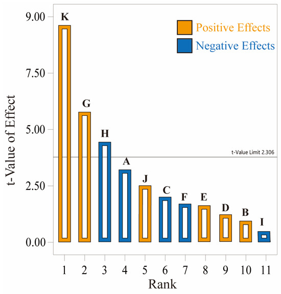 Standardized pareto chart of the impact factors. A~K correspond to the impact factors in Table 3.