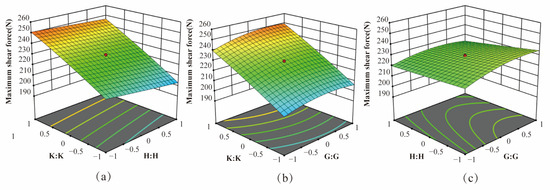 Table 9 shows the CCD results, which were analyzed by ANOVA. The results show a second-order regression model with p < 0.0001, a coefficient of determination R2 = 0.9708, and a corrected coefficient of determination R2 adj = 0.9446, both of which were close to 1. This shows a highly significant relationship between the dependent variable (maximum shear) and all independent variables. The order of each factor’s influence on the maximum shear was C > B > A. Only the A2 interaction term had a significant effect on the maximum shear force. The effects of the remaining interaction terms were statistically insignificant.