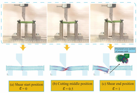 Finally, one set of optimized solutions with relative errors < 1% was obtained. The coded values are (G = −1.665, H = 1.235, and K = 0.443), corresponding to the simulation parameters of normal stiffness at 1.0367 × 1010, tangential stiffness at 7.5859 × 109, and bond radius at 1.0611. These were used as the optimal contact parameters. Simulated shear tests conducted with these optimal contact parameter combinations yielded a curve delineating the relationship between shear force F and radial strain of the stalk, which was then analyzed and compared with real test results. The test results showed that at all stages of shearing (beginning, middle, and end), phenomena such as bond compression by shear, neat cut-off, and cross-sectional rupture concurred with observed real-life phenomenon, thereby providing a better characterization of tomato stalk shear damage morphology. The tomato stalk shearing process with the bond breaking process shown in Figure 9 was obtained. Figure 10 shows a comparative analysis between the measured mechanical test results and simulation test results for the radial strain–shear force: