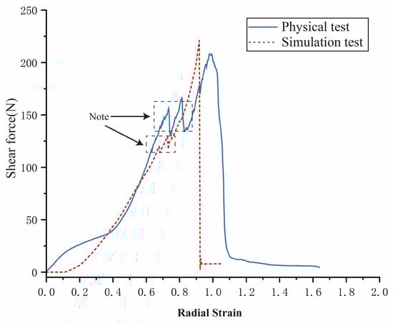 Radial strain–shear force curves obtained from physical and simulation tests.