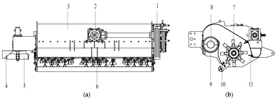 Structure diagram of cotton stalk crushing device. 1. Transmission system. 2. Gearbox assembly. 3. Machine shell. 4. Dispersing wheel cover. 5. Dispersing wheel. 6. Three-point suspension device. 7. Shatter knife shaft assembly. 8. Spiral conveying blade. 9. Spiral conveying device groove. 10. Pressure film wheel. 11. Fixed knife. (a) Device main view. (b) Device left view.