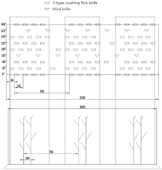 In order to improve the function of airflow transportation and improve the fluidity of straw, a special flail knife named a wind knife was designed in this machine. As shown in Figure 2. The arrangement of shredding knives and their corresponding relationship with cotton rows are shown in Figure 3.