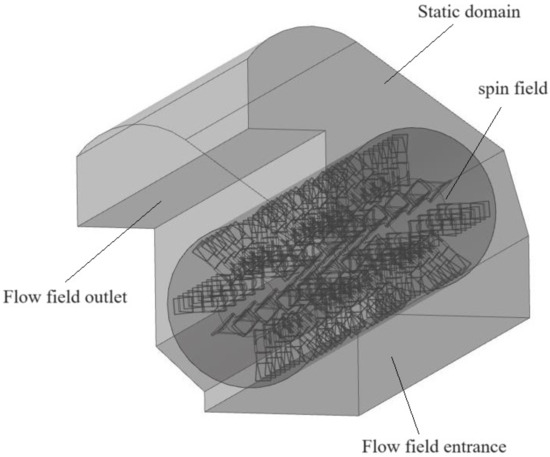 Firstly, the three-dimensional CAD software Inventor 2020 is used to establish the three-dimensional model of the shell of the crushing chamber and the crushing device. After the modeling is completed, it is saved as x-t format. ANSYS Workbench is run, SpaceClaim is run and the simplified three-dimensional model is opened. The fluid domain is extracted by the volume extraction function, and the fluid domain is divided into a rotating domain and a stationary domain. In order to ensure that the grid nodes on the interface of the rotating domain and the stationary domain are consistent during the subsequent meshing, a shared topology needs to be specified. At this time, the extracted fluid domain is extracted from the solid model. The inlet and outlet of the airflow field are the actual positions in the device. The inlet is close to the rotating domain. In the subsequent Fluent calculation, it is necessary to define the pressure boundary, and the gauge pressure is 0, but there is a certain deviation from the reality. The actual situation is that the airflow inflow at the entrance has undergone certain development, and the gauge pressure is not 0. Therefore, the fluid domain model is selected to be slightly modified, and the cross-sectional area is kept the same at the entrance and slightly stretched along the normal direction of the cross-section.